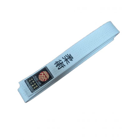 Пояс шьется из плотной хлопчатой ткани. Название вида каратэ вышивается на японском языке с помощью металлизированной нити золотого цвета. Для дополнительной прочности внутри пояса идет белая жесткая хлопковая лента и прострочка в 8 рядов по всей длине. Все это позволяет поясу не терять форму и цвет много лет.